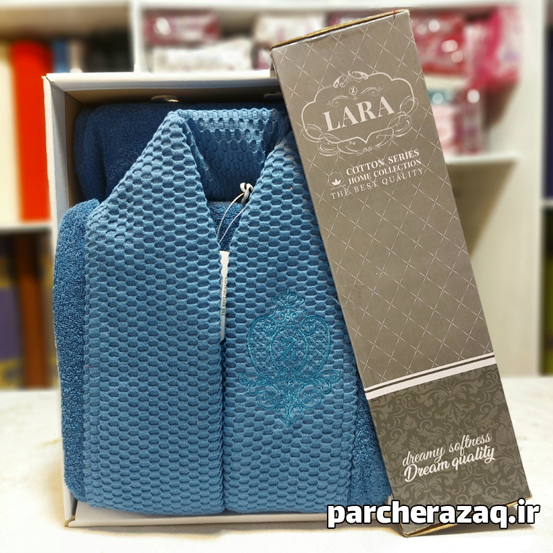 یکی از زیباترین حوله های موجود در فروشگاه سرای پارچه و حوله رزاق، حوله ی تن پوش لارا تبریز می باشد. این حوله در عین زیبایی، کیفیت بالایی نیز دارد. حوله تن پوش لارا تبریز دو رو آب گیر است. یعنی هر دو طرف حوله بافت آب گیر دارد و بافت مخمل در آن به کار نرفته است. در نتیجه احتمال پرز دهی در حوله نزدیک به صفر است. آب گیری بالای این حوله از ویژگی های ناب آن است. حوله ی لارا، تراکم بافت بالایی دارد. درجه ی کیفی آن اعلا می باشد. اگر میخواهید هدیه ای شیک، لوکس و ماندگار بدهید و یا حتی برای تهیه ی سرویس جهیزیه نیاز به حوله دارید پیشنهاد اول سرای پارچه و حوله رزاق حوله های تن پوش لارا به دلیل زیبایی و کیفیت بالای آن می باشد. سایز آن 125 یا لارج است. رنگ آن ثابت می باشد و پرز دهی ندارد. حوله دارای کلاه متصل، کمربند و جیب می باشد. عکس های موجود ژورنالی نمی باشد و ضخامت و آب گیری حوله تن پوش را میتوانید در عکس ها و فیلم مشاهده کنید.برای تطابق سایز بندی به جدول سایز بندی در بخش مشخصات مراجعه کنید همچنین میتوانید به کارشناس با شماره 09223990518 تماس بگیرید و از مناسب بودن اندازه اطمینان یابید.
