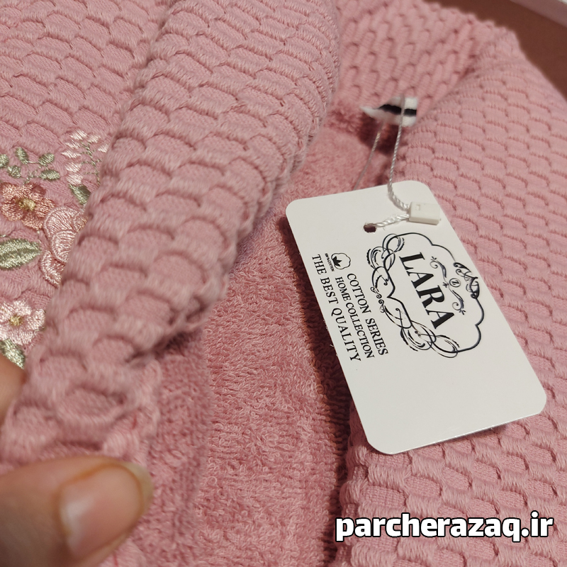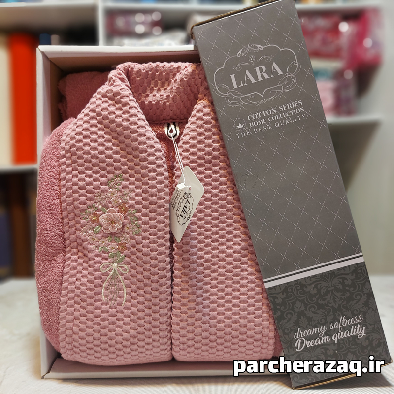یکی از زیباترین حوله های موجود در فروشگاه سرای پارچه و حوله رزاق، حوله ی تن پوش لارا تبریز می باشد. این حوله در عین زیبایی، کیفیت بالایی نیز دارد. حوله تن پوش لارا تبریز دو رو آب گیر است. یعنی هر دو طرف حوله بافت آب گیر دارد و بافت مخمل در آن به کار نرفته است. در نتیجه احتمال پرز دهی در حوله نزدیک به صفر است. آب گیری بالای این حوله از ویژگی های ناب آن است. حوله ی لارا، تراکم بافت بالایی دارد. درجه ی کیفی آن اعلا می باشد. اگر میخواهید هدیه ای شیک، لوکس و ماندگار بدهید و یا حتی برای تهیه ی سرویس جهیزیه نیاز به حوله دارید پیشنهاد اول سرای پارچه و حوله رزاق حوله های تن پوش لارا به دلیل زیبایی و کیفیت بالای آن می باشد. سایز آن 125 یا لارج است. رنگ آن ثابت می باشد و پرز دهی ندارد. حوله دارای کلاه متصل، کمربند و جیب می باشد. عکس های موجود ژورنالی نمی باشد و ضخامت و آب گیری حوله تن پوش را میتوانید در عکس ها و فیلم مشاهده کنید.برای تطابق سایز بندی به جدول سایز بندی در بخش مشخصات مراجعه کنید همچنین میتوانید به کارشناس با شماره 09223990518 تماس بگیرید و از مناسب بودن اندازه اطمینان یابید.